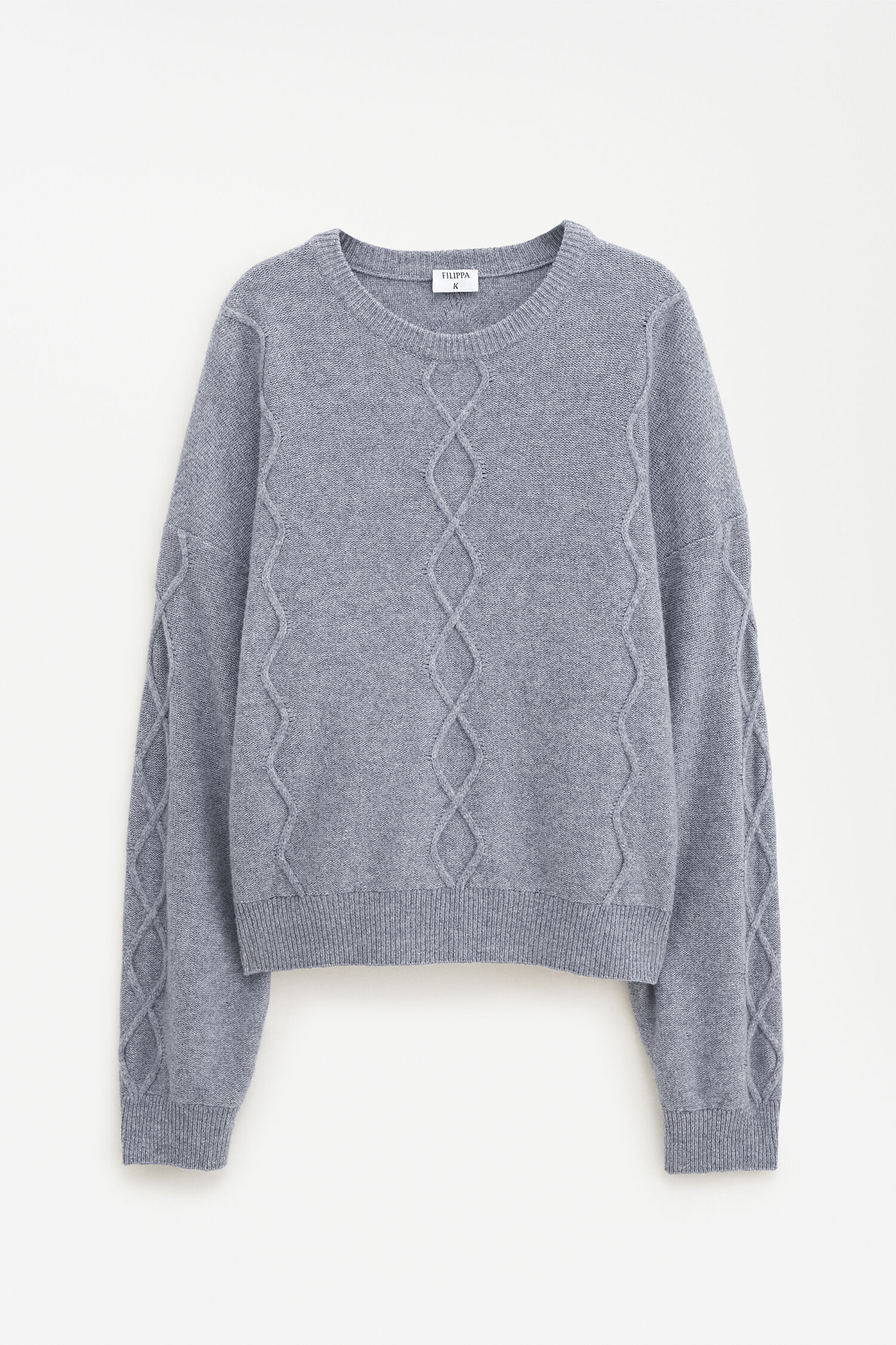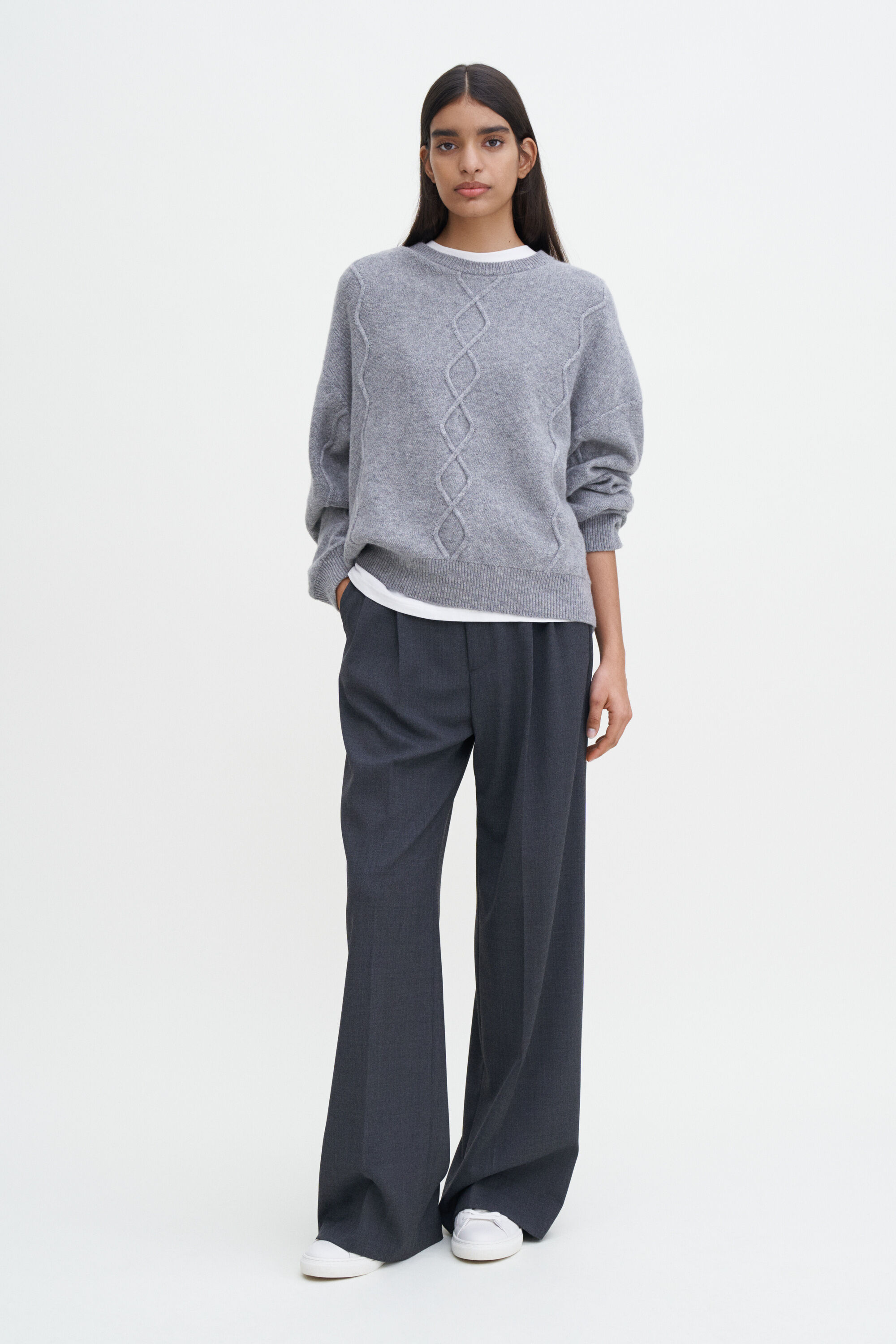 The unisex Diamond Cable Sweater is knit from RWS-certified wool and recycled cashmere blend. Designed with a diamond zig zag cable texture, hip length, and double ribbing at the neck.