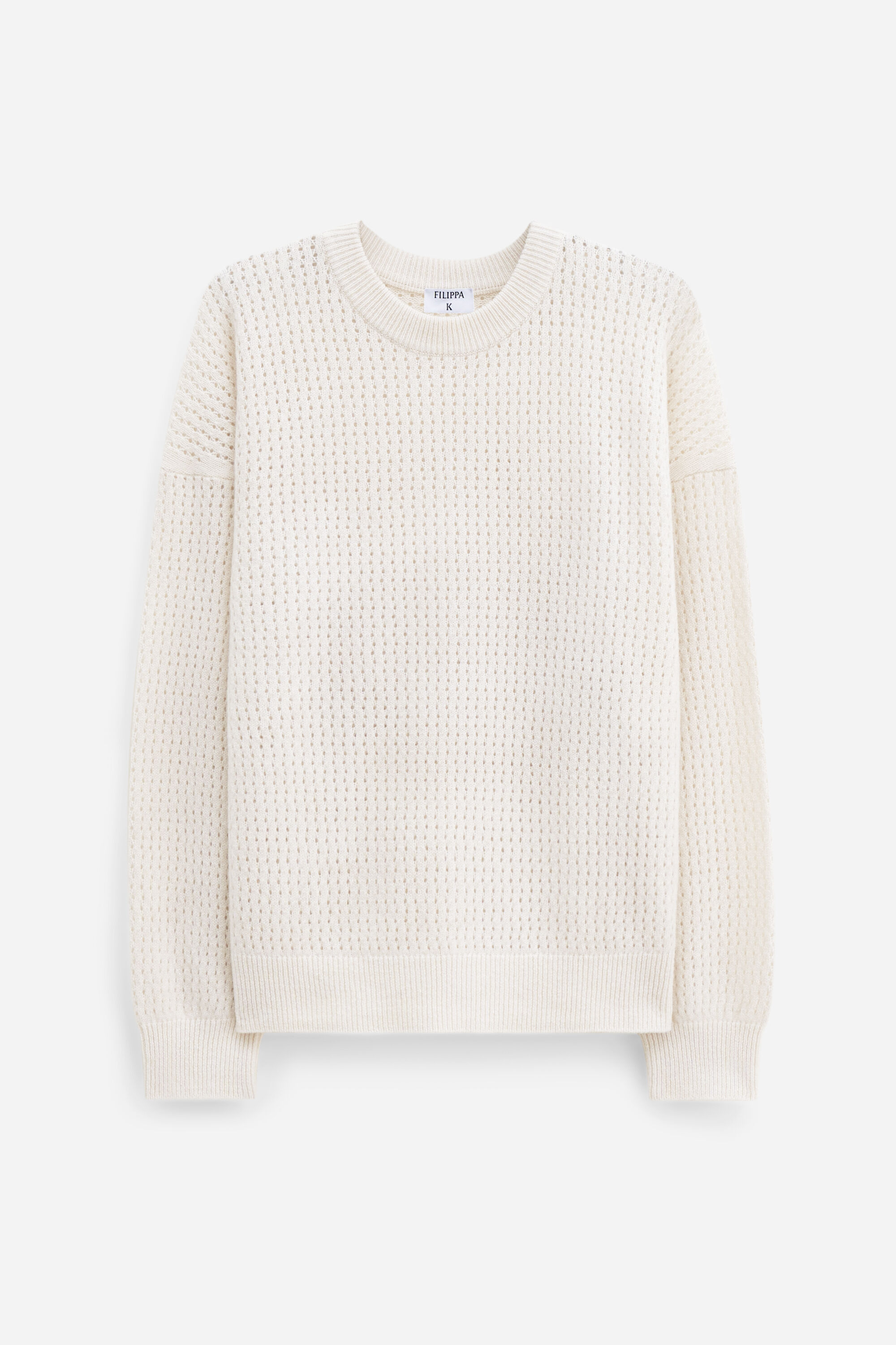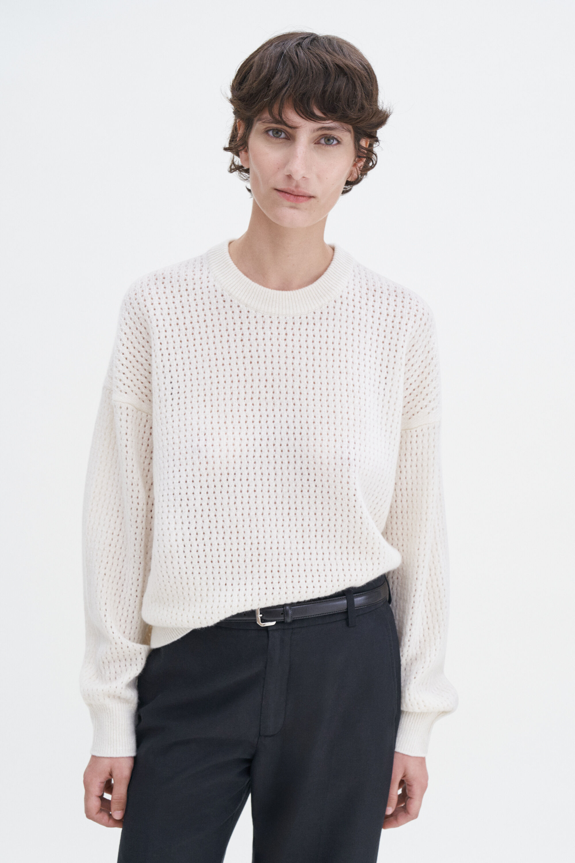 The Pointelle Knit Sweater has an oversized fit in soft Italian wool cashmere yarn, with a mid-weight and allover pointelle pattern. The wool in this garment is traced from farm to hanger as part of the Fiber Traceability Initiative.