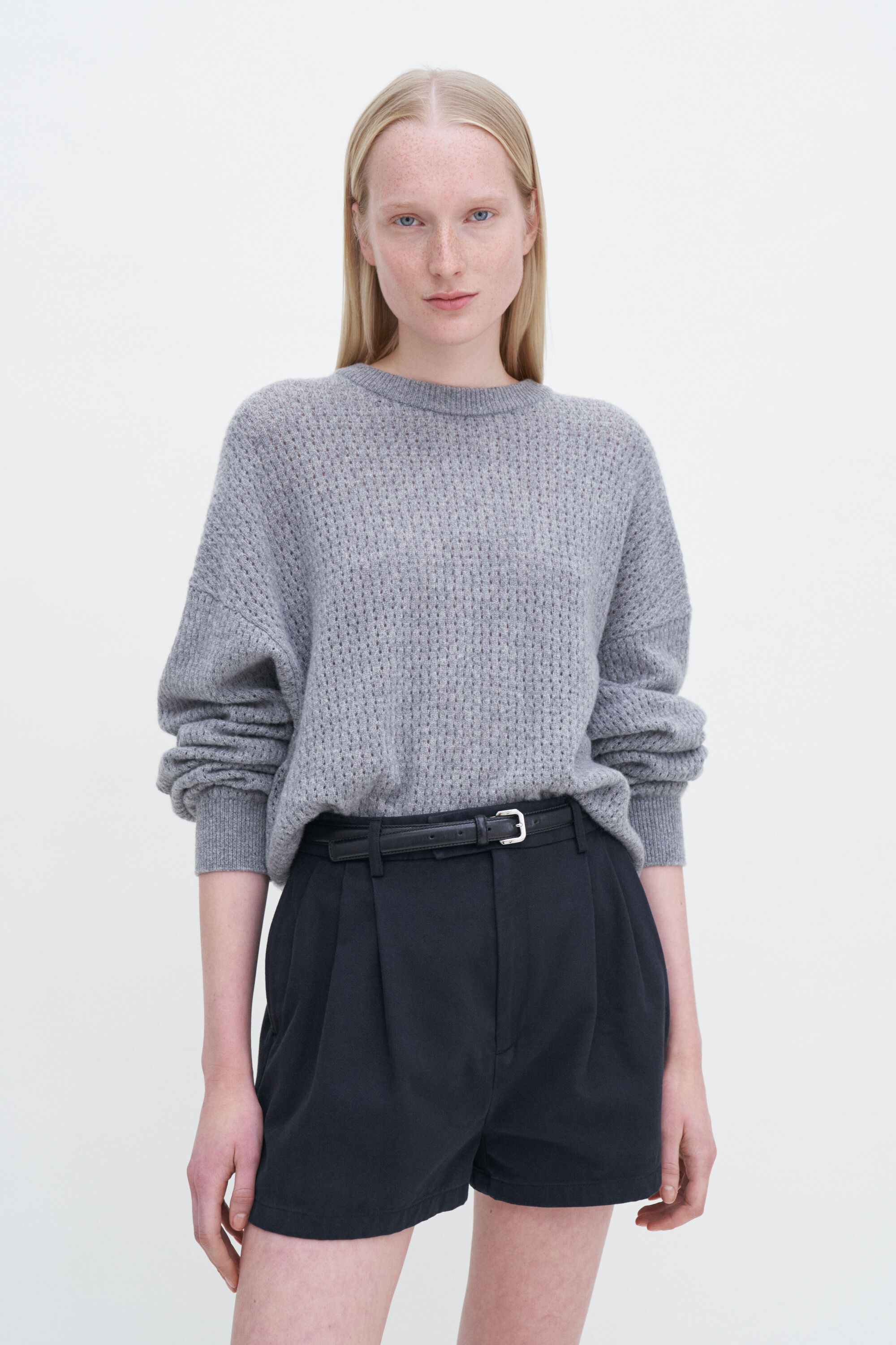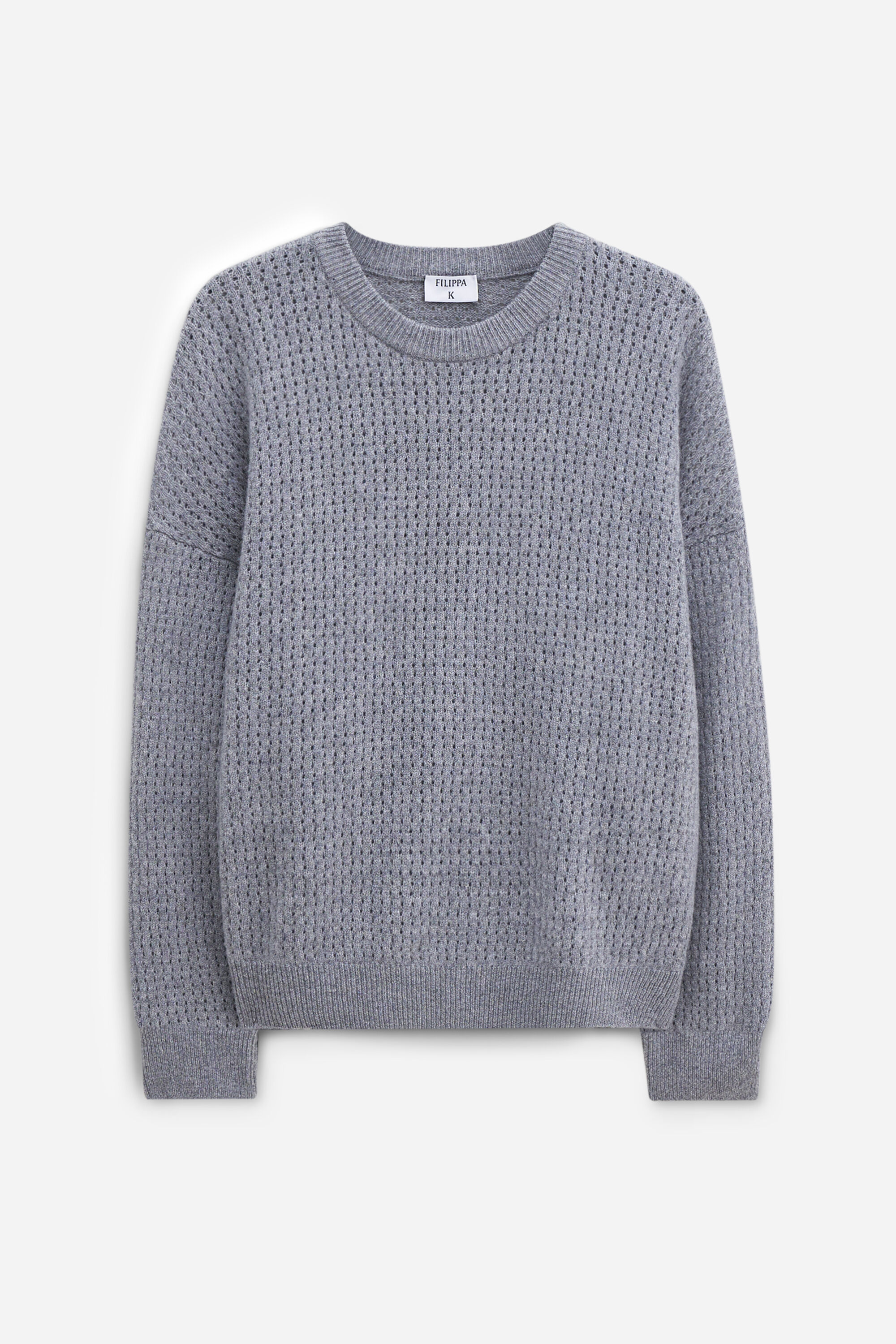 The Pointelle Knit Sweater has an oversized fit in soft Italian wool cashmere yarn, with a mid-weight and allover pointelle pattern. The wool in this garment is traced from farm to hanger as part of the Fiber Traceability Initiative.