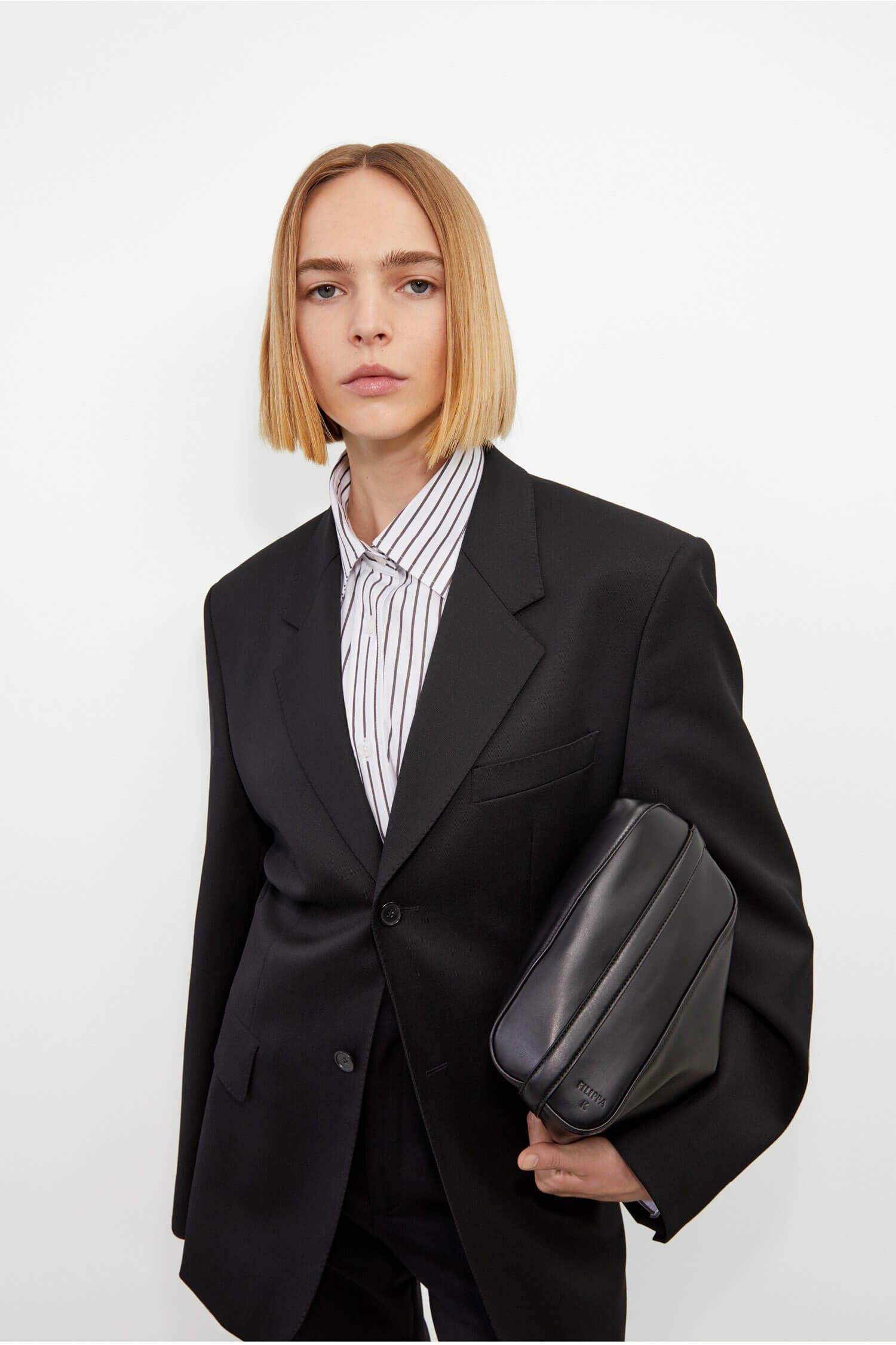 The Hourglass Blazer is designed with padded shoulders, an extra long sleeve and a fitted waist, creating our signature hourglass silhouette. It's crafted from a mid-weight wool blend with slight stretch. Wear it with the Darcey Trousers for a full suit look. This garment is part of Anna Teurnell's debut capsule collection for Filippa K.